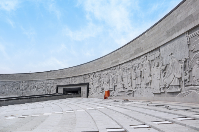 祭禹廣場已建設一新,水上祭壇、鐘亭、鼓亭、洛書臺、圖騰柱,氣勢壯闊。 廣場后的巨幅浮雕墻上繪刻了大禹的人生經(jīng)歷與偉大業(yè)績。左側為治水主題,敘述禹生石紐、受命治水、地平天成等九部分內(nèi)容;右側為立國主題,記錄大禹平定三苗、劃分九州、鑄造九鼎、歸葬會稽等九部分事跡。整幅浮雕如敘事長卷,令人震撼,展現(xiàn)了越地源遠流長的禹文化脈絡,傳遞華夏先祖的不朽精神。浮雕墻下,排列著13個方陣,可容納1萬人參與公祭典禮。