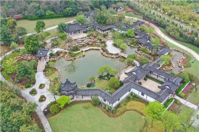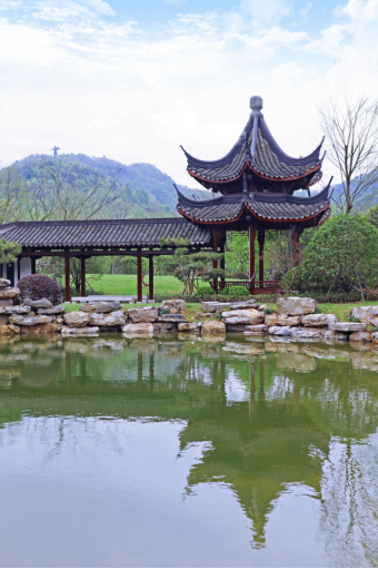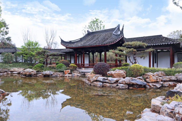 古樸亭臺的飛檐墨瓦,被春雨浸潤得锃亮