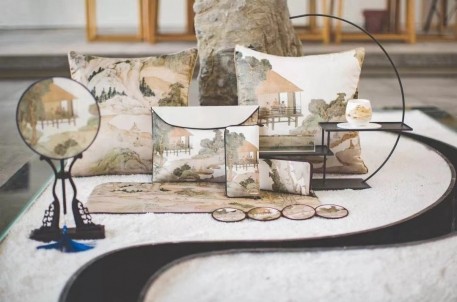 本次“曲水流觴”雅集系列,一共有兩大類別,十四款產品。設計以《蘭亭修禊圖》為藍本創作。該圖是明代畫家文徵明創作的一幅金箋紙本,藏于故宮博物院。此圖描繪東晉永和九年,王羲之邀請友人曲水流觴的雅集盛會。是青綠山水代表作。設計師將部分局部重組,用中國繪畫最擅長的留白之技,帶給我們一條遐想萬千的曲水之路,將古-畫-今三個時空構架在一起,讓人俯仰之間,感受曲水流觴帶給我們生活的美好。