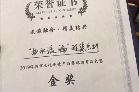 2019年12月18日,2019紹興市文化創意產品暨旅游商品大賽決賽,在紹興市文化廣電旅游局舉行。決賽中,體現歷史底蘊的文創產品、經過全新設計的旅游商品,以及推陳出新的工藝美術精品,匯集一堂,光彩奪目。大賽以“文旅融合·精美紹興”為主題。意在推動紹興歷史文化、山水風情和特色物產融合發展。決賽中,蘭亭的故事文創系列產品,“曲水流觴”雅集系列,體現歷史底蘊、經過全新設計,喜獲金獎。蘭亭碑3D小夜燈,榮獲優秀獎。