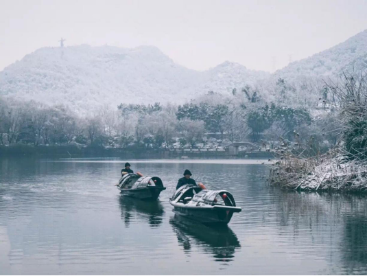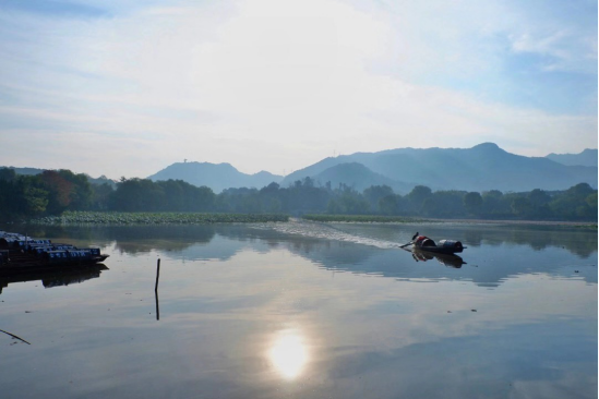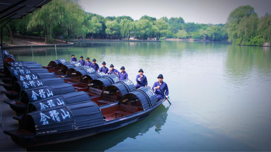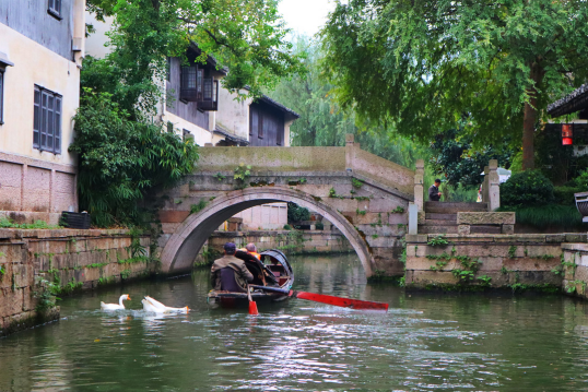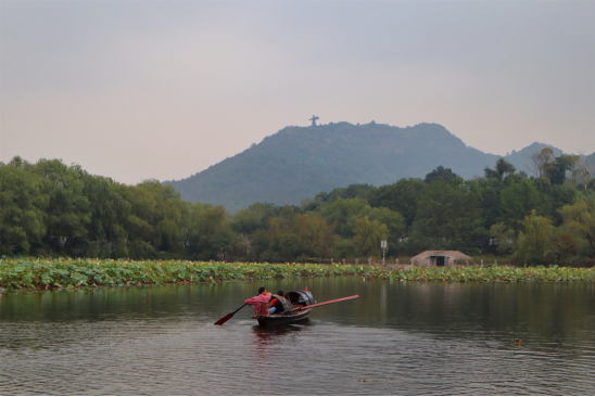烏篷由荷池穿行而過,遠(yuǎn)山帶朝暉,天際接秋水。沿著北面水道,小船徐徐駛?cè)肭宄康墓糯迳钐帲瑺?zhēng)渡,爭(zhēng)渡驚起一雙憨態(tài)可掬的水中白鵝,叫人頻頻回眸。