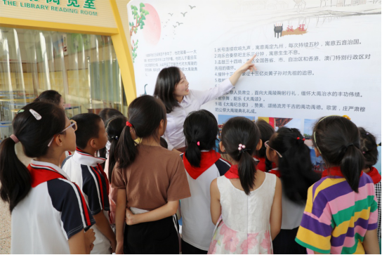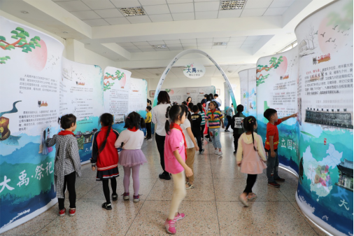 展覽內(nèi)容立足于大禹文化,具體分為生平家世、治水功績、立國功績、祭祀典禮等幾大塊,以通俗易懂的語言講述大禹故事,配以各類生動(dòng)活潑的插圖。學(xué)校里的小朋友們在講解員姐姐的帶領(lǐng)下,一字一句地認(rèn)真閱讀著,接受著大禹文化的熏陶。
