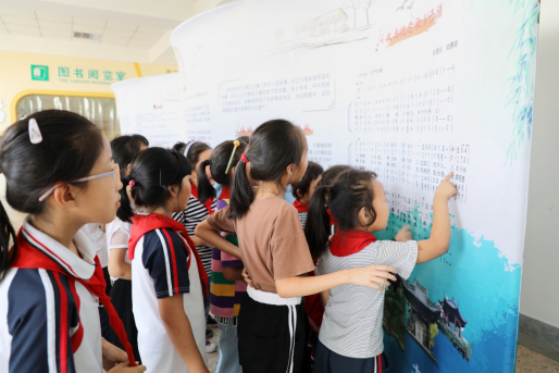 大禹文化進(jìn)校園首站——稽山小學(xué)。書寫著各類大禹治水、立國故事的展板陳列在校園內(nèi)引起了小朋友們的強(qiáng)烈興趣。