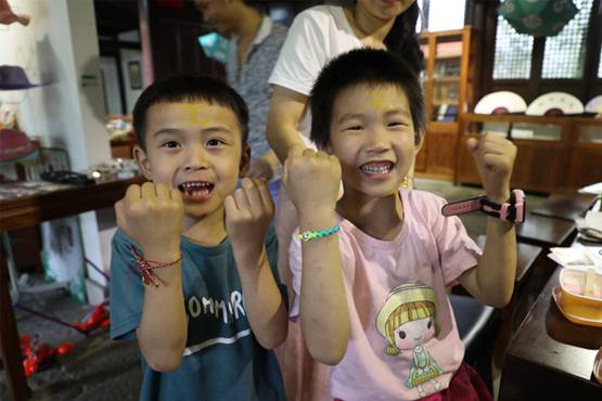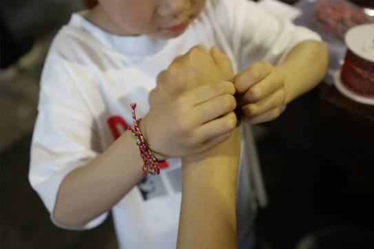 禹陵文創店內,擺置了各色絲線。漢代以來,舊時端午,人們慣于在手腕、腳腕、脖子上拴五色線,謂之可保平安,能避禍災。不如就仿古人之習結線為繩吧!