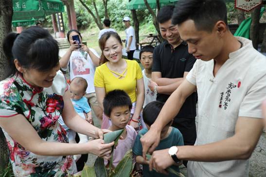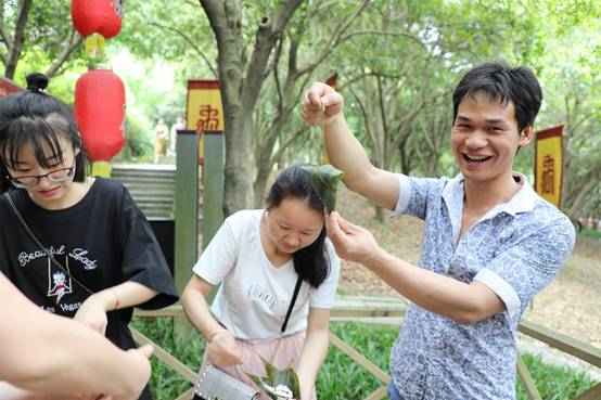行走在桂花林深處,隨風飄來米香、粽葉香,不少游客正圍在桌旁興致盎然地包著粽子。粽包分兩髻,艾束著危冠。手中的粽子還未成型,已想到它煮熟后軟糯香甜的口感。吃了粽子,端午才算過得圓滿。