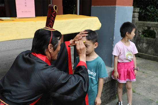 享殿另一側,許多小朋友正乖巧地排著隊,等待禮生為自己畫額啟智。 端午以雄黃涂抹小兒額頭可驅避毒蟲,寄托著長輩們希望孩子健康平安、開啟智慧的美好愿望。