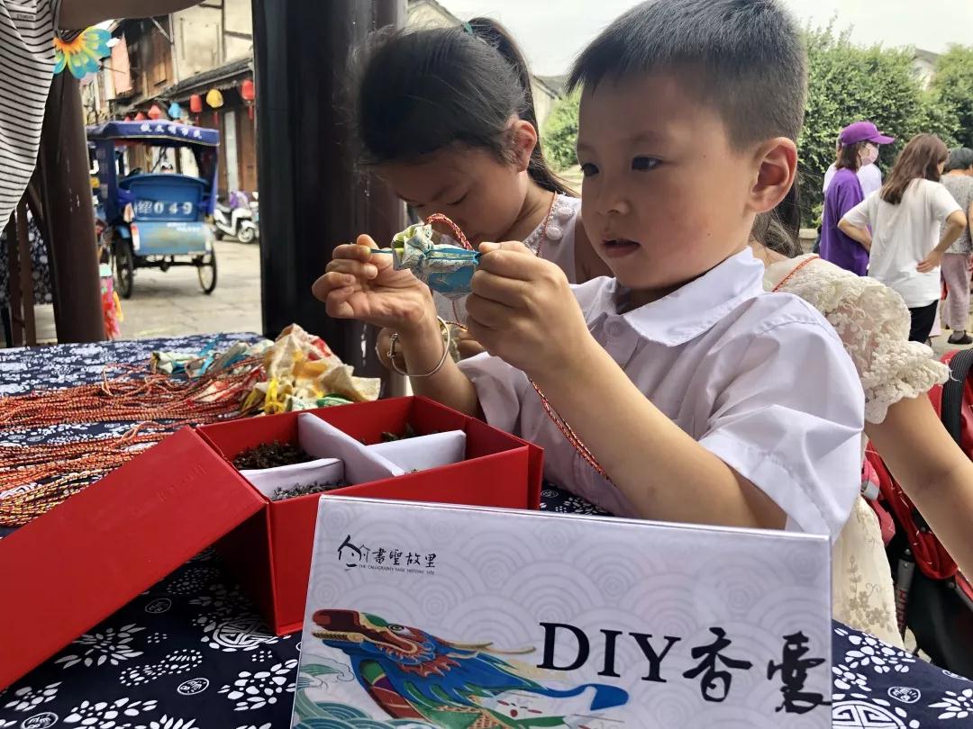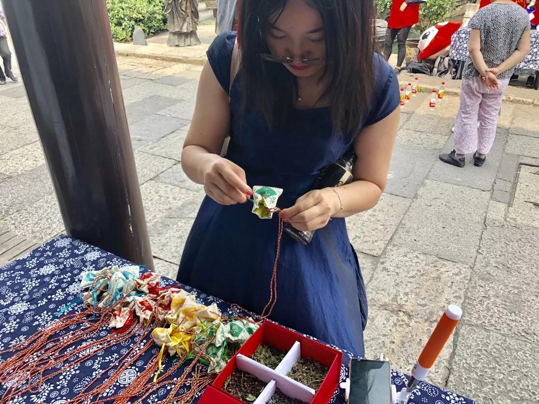 佩香囊是端午傳統習俗之一,有驅邪避瘟之意,還有驅蚊去乏的作用。游客朋友們將艾草、丁香、薰衣草、薄荷等中草藥裝進香囊內,不僅能防止蚊蟲叮咬,還能寄托美好的祝愿。