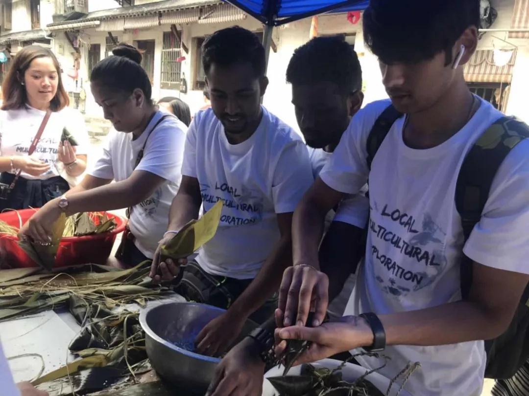 包粽子是端午佳節必不可少的環節。糯米、粽葉、烏豇豆一字排開,游人們在經驗豐富的包粽師傅帶領下學包粽子。只見師傅拿起粽葉挽成漏斗,鋪上糯米塞入烏豇豆,再鋪一層糯米,粽葉一合,拿繩子迅速捆扎,一個結實的傳統烏豇豆粽就包好了。