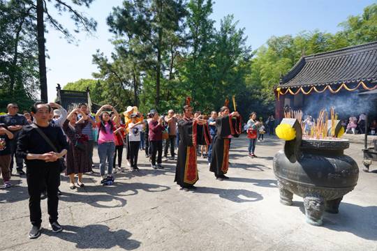 “民祭大禹”儀式為大禹陵景區(qū)最具特色的文化表演。通過祭祀禹王,展現(xiàn)延續(xù)千年的中華禮儀,彰顯非遺文化之美,表達(dá)華夏兒女對立國始祖的追懷之情。端午期間,享殿每日呈現(xiàn)六場極具體驗(yàn)感、互動感的祭禹表演,游客可身著古服參與其中,在司儀主持下敬酒、敬香、祈福,感受古老文化的魅力。