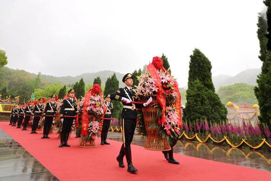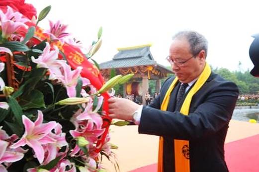 敬獻花籃。禮兵抬起主花籃,緩步走向祭祀廣場,擺放在祭臺中央。主祭人彭佳學代表省委、省政府敬獻花籃,他仔細整理花籃綬帶,面向大禹陵三鞠躬。隨后,李衛寧、張澤熙、吳文慶、馬衛光、港澳同胞、臺灣同胞、海外僑胞、大禹后裔代表也敬獻花籃。