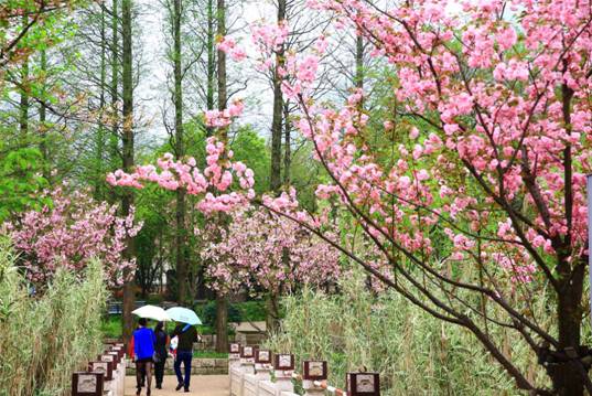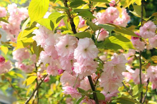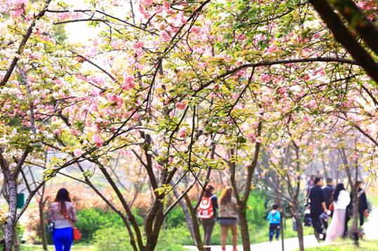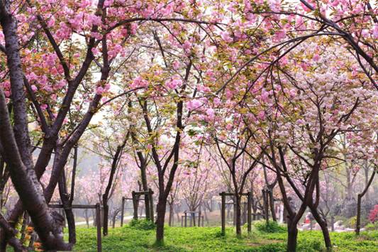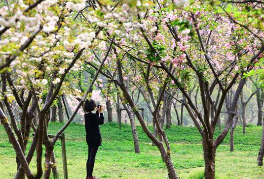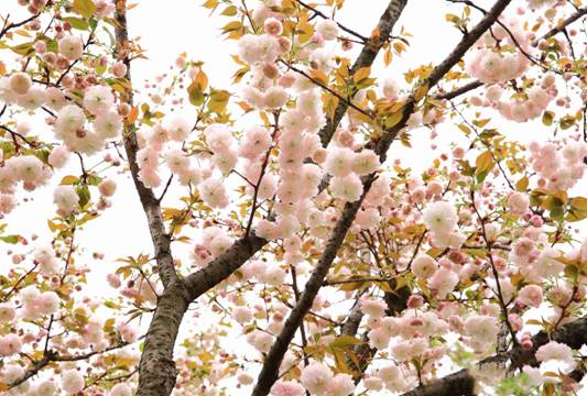 晚櫻偏愛繁華。綴于枝頭者,少則兩三朵、多則四五朵聚生,櫻花園中便成了一派“千朵萬朵壓枝低”的景象。