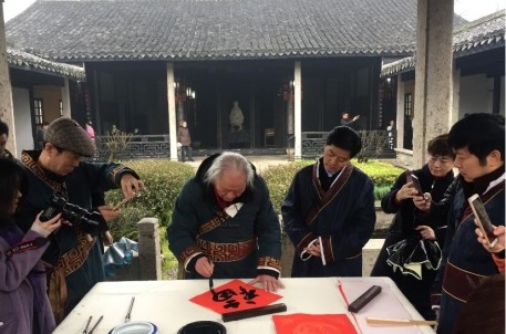 今年的大年初一上午10點(diǎn),按照慣例,景區(qū)主要領(lǐng)導(dǎo)、市委宣傳部副部長(zhǎng)、市文化廣電旅游局局長(zhǎng)何俊杰、以及蘭亭書會(huì)的書法家們首先在景區(qū)右軍祠完成晉圣儀式。與年不同的是,今年各位書法家們?cè)跁x圣后一同齊聚墨華亭,迎來(lái)書法圣地蘭亭的首屆“年度漢字發(fā)布會(huì)”。由蘭亭書會(huì)會(huì)長(zhǎng)王建華宣布“融”為本年度漢字,并開筆書“融”,其余書法家均紛紛揮毫,墨華亭下墨飛花,與游客朋友共同見(jiàn)證這一有意義的時(shí)刻!