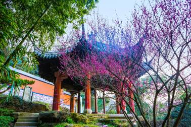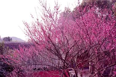這個時節(jié)的禹廟東皋窆石亭下,還有風(fēng)景獨好的“一枝春”——一樹紅梅,花開正宜。它的樹齡已近50年,春近,綻放得更為茂密,古老的會稽山水與紅梅梅相映,讓人不禁駐足觀賞。