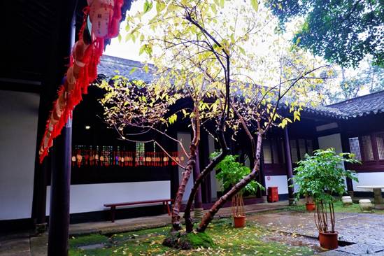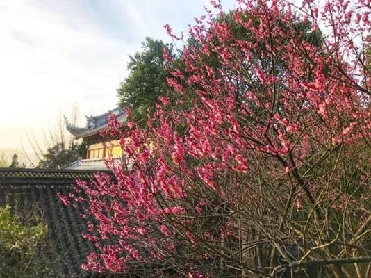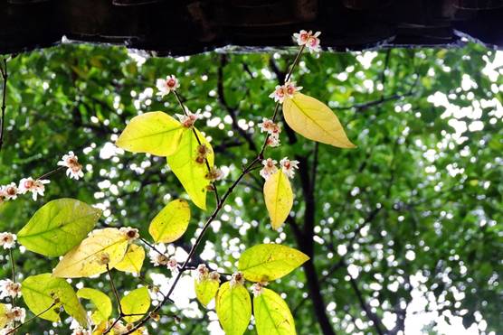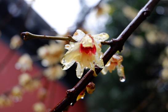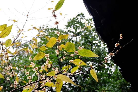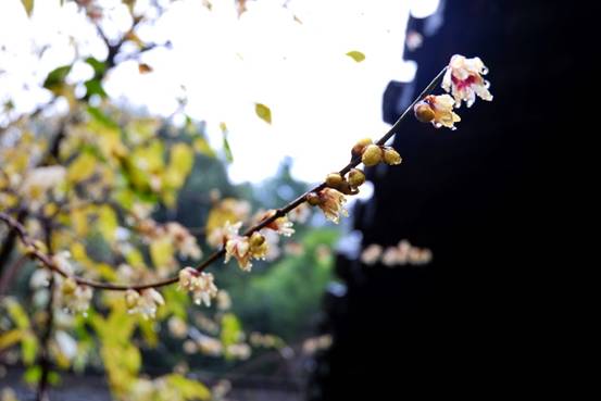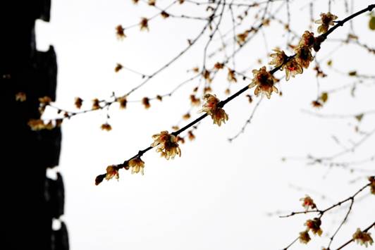 在禹廟旁的墨瓦下,映出一小片一小片明黃的活潑顏色,再走近一些,原是幾樹蠟梅正煢煢然地盛開著。