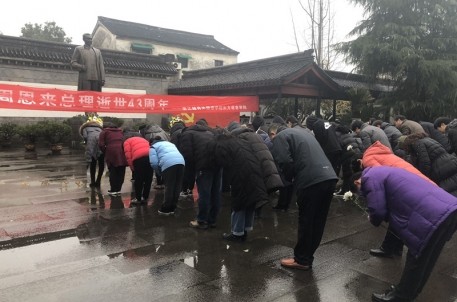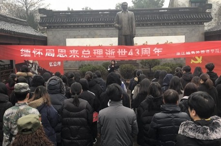 為紀(jì)念周恩來總理逝世43周年,2019年1月8日上午,周恩來研究會會員、浙江越秀外國語學(xué)院東語學(xué)院分團(tuán)委、周恩來班學(xué)生代表以及名人故居工作人員在周恩來紀(jì)念廣場舉行紀(jì)念活動。同學(xué)們向周恩來銅像敬獻(xiàn)花籃、重溫入團(tuán)誓詞、集體詩朗誦,用自己的行動緬懷總理。通過此次活動,旨在進(jìn)一步激發(fā)和引導(dǎo)廣大青年學(xué)生以周恩來總理為榜樣,學(xué)習(xí)總理精神,樹立“為中華之崛起而讀書”的雄心壯志,為中華民族的偉大復(fù)興而貢獻(xiàn)力量。