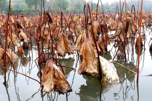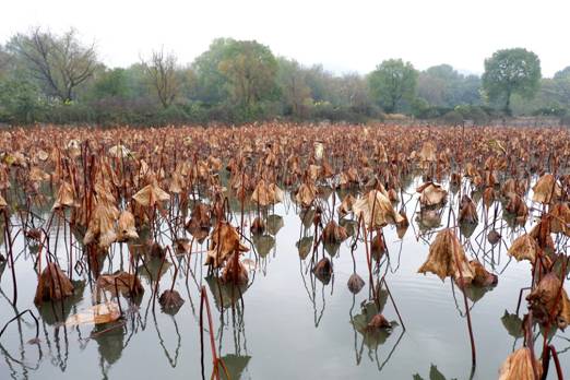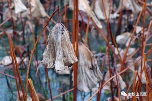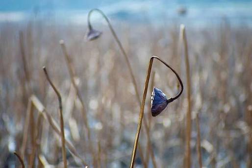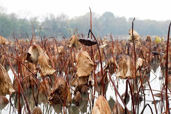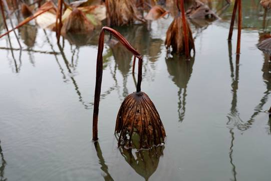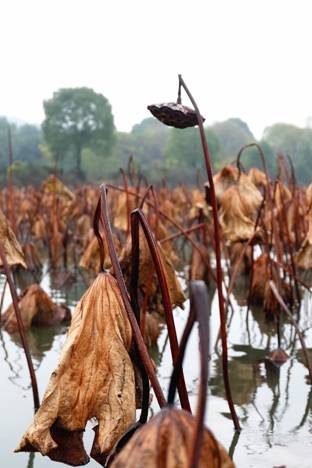 荷雖枯殘,卻并未失去蘊藏在生命深處的活力,那些埋藏在淤泥深處的蓮藕正積蓄力量,靜靜地等待春天、準備生命的又一次勃發。