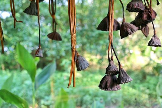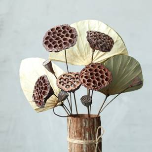 取蓮蓬風干,其根莖依然堅強、驕傲地挺立著,將它們隨意地插在大花瓶中,又是另一種情調。