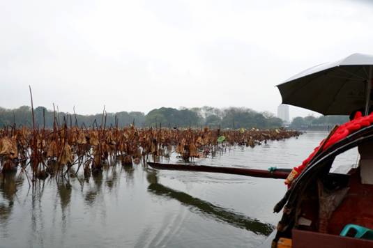 大禹陵紅菱池內的枯荷在幾場冬雨的洗禮下,也褪去了秋夏時期那些熱鬧的綠色,在水面上或立或臥,或實或虛,呈現出千姿百態的幾何圖形,別具韻味。