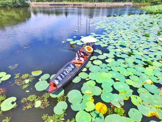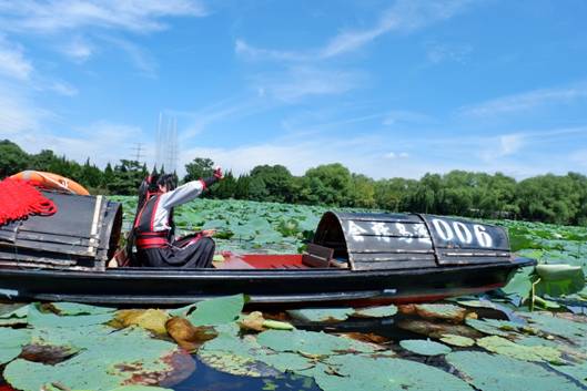 會稽山下,秋風乍起,乘一葉烏篷,徐徐劃動船槳,一池紅菱碧葉便隨著推開的水波搖曳起來,快哉之情亦蕩然而生。游客朋友們在乘坐烏篷船時,可近距離觀賞紅菱,了解其生長環(huán)境,聽船夫講述采摘紅菱的技巧,并免費品嘗當季新鮮紅菱。