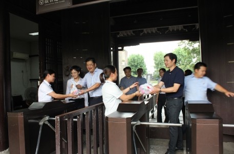 領導們先后來到景區停車場、售票、講解、檢票等一線接待崗位了解情況,每到一處都向在酷暑中堅持工作的員工表示親切的慰問和誠摯的感謝,并叮囑員工們在為游客提供優質服務的同時,要注意勞逸結合,合理安排作息,注意自身身體狀況,并為他們送上防暑降溫物品。
