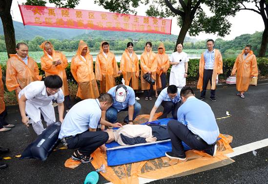 人員搶救。醫(yī)療救護組到達事發(fā)現(xiàn)場對落水者進行搶救,將其抬到陰涼處,用人工呼吸、心臟按壓等手段進行搶救,同時等待120急救車的到來。后勤保障組警戒現(xiàn)場,安撫游客情緒。