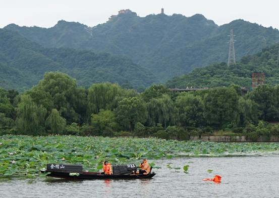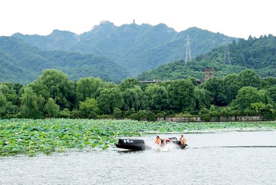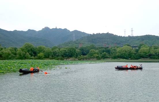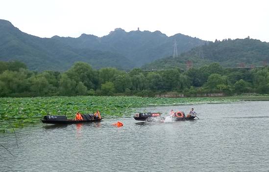 隨后,水上救生演練展開。一條載有一對情侶的烏篷船向荷花池劃去。