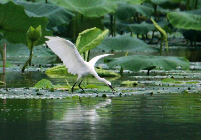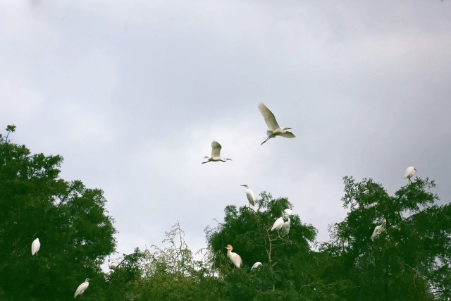 遠處小林中,白鷺成群,熙熙攘攘。幾行白鷺穿行在叢中、水面上,以水為鏡、翩躚起舞。