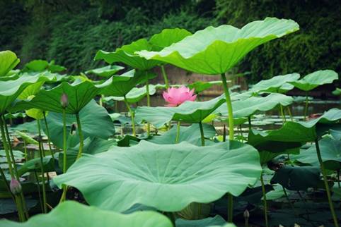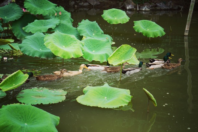 荷塘深處,偶有幾只小鴨子暢游在綠意間,為荷塘增添了不少生趣。
