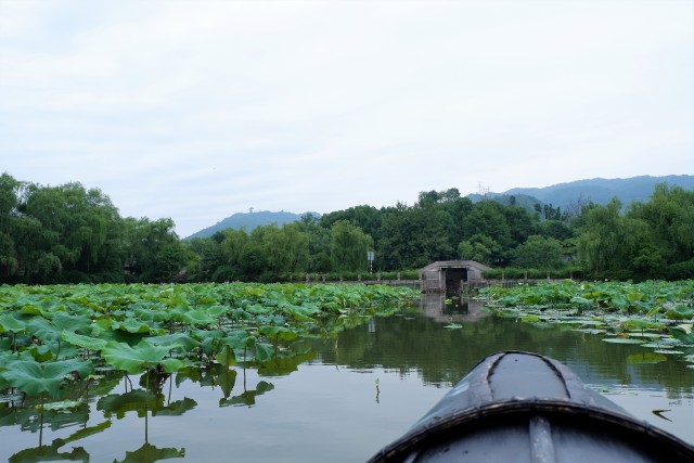 “池面風來波漣漣,波間露下葉田田。” 蓮葉荷塘,在青山隱隱下,一片片碧綠的荷葉熱鬧地鋪展開來。微風徐來,擇一艘烏篷船暢游在“荷”中莫不是最好的選擇?