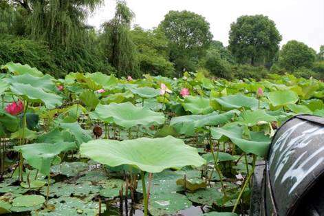 烏篷劃進荷塘,發(fā)現(xiàn)已有不少的荷花從最初的小荷才露尖尖角到紅白相間亭亭玉立。在雨露的映襯下,周遭仿佛都靜了下來。