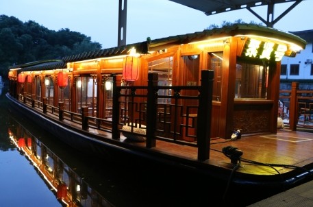 “聚賢號”和“會稽號”是水城公司全新打造的兩艘富有濃郁水鄉特色的豪華畫舫。這兩艘新船外型、內部構造和機器配置一模一樣,金色鋁瓦裝飾的船頂,木包鋼技術,擁有靚麗的菠蘿格紅木材質“外型”和堅硬的鋼制“內臟”。船艙內部配套設施齊備,紅木桌椅,液晶電視、卡拉OK點歌器一應俱全,還設有獨立衛生間和開水間,適用于各類政務接待、商務活動和私人定制服務,相當美觀大氣。