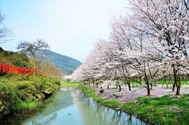 充滿春天氣息的小河,在櫻花爛漫時,漫山遍野的櫻花將山麓點綴得粉嫩水靈,沉浸于此,心生浪漫。