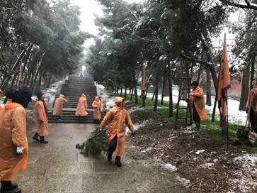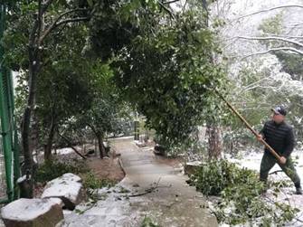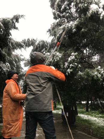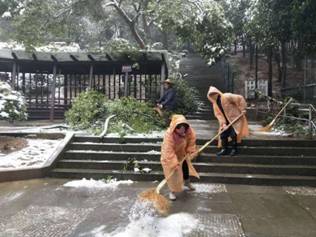對(duì)于大樹上的積雪,細(xì)心地用竹竿輕輕敲落。散落的雪水使頭發(fā)上結(jié)了冰渣,手和臉都被凍得通紅,但這一切絲毫沒(méi)有影響到大家的干勁。