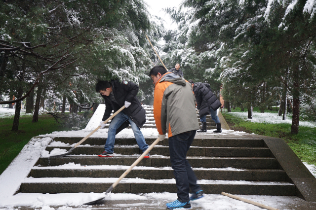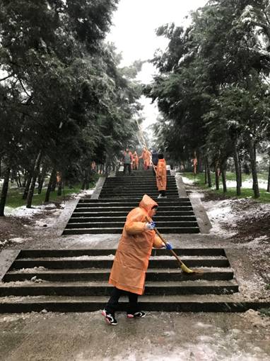 景區(qū)的工作人員不畏嚴(yán)寒,積極地投入到掃雪隊(duì)伍中。
