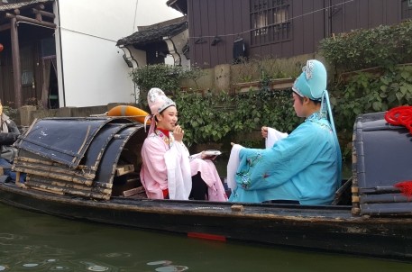 活動期間,魯迅故里河上兩條烏篷船格外引人注目,一條烏篷上兩位女孩身著戲服,唱著悠揚婉轉的越??;另一條烏篷船上長發飄飄的女子彈奏著溫婉細膩的古箏,引得河岸上的游人紛紛駐足觀看,許多人還拿起相機、手機拍個不停,乘船的游客更是絡繹不絕。