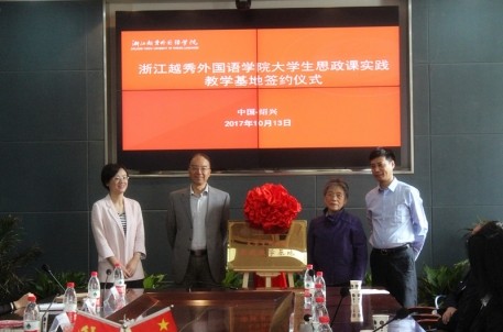 2017年10月13日上午,浙江越秀外國語學院與紹興市名人故居管理處共建大學生思政課實踐教學基地簽約儀式在越秀外國語學院鏡湖校區(qū)舉行。周恩來鄧穎超秘書、全國政協(xié)原副秘書長趙煒女士,紹興市名人故居管理處主任曾紹暉,越秀外國語學院黨委書記費君清、黨委副書記施文妹等出席儀式,并為實踐教學基地揭牌。