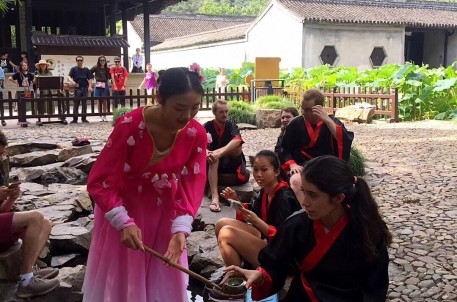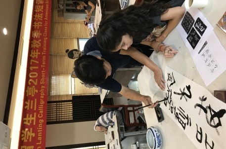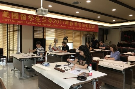 2002年,“塔夫茨在中國”項目開始運行。每年秋季,美國塔夫茨大學都會派出喜歡中國文化的學生到紹興進行為期數日的游學旅行,紹興蘭亭是他們每次游學的其中一站。在這里,他們認真聆聽書法家喻革良講述《有趣的漢字與奇妙的書法》,講漢字的起源及演變過程,講“天下第一行書”《蘭亭集序》的故事,同學們還握筆感受了書寫的樂趣。在曲水流觴景點,同學們穿著中國漢服載歌載舞,并用簡單的中文學著作詩,演繹千百年前的文人雅事。