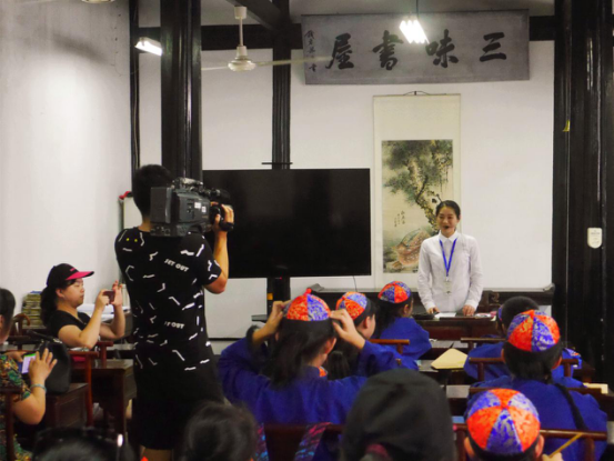 8月2日下午,三味書屋研學游教室內書聲瑯瑯。在景區工作人員的帶領下,20余名學生體驗了全新改版的三味私塾體驗課,紹興電視臺新聞綜合頻道攝制組全程跟蹤拍攝。作為首批全國研學旅游示范基地之一,2017年“三味書屋——魯迅故里研學游”活動全面升級,內容更精彩,形式更新穎。我們希望每位走近研學游課堂的孩子不僅能重溫魯迅兒時的課堂生活,更能感受到古城紹興深厚的歷史文化底蘊。(劉維佳)