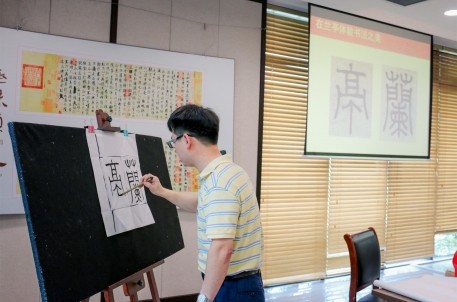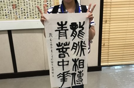 為了使同學(xué)們對祖國傳統(tǒng)書法文化有更進一步的認(rèn)識和了解,景區(qū)工作人員還特別邀請了中國書法家協(xié)會會員、蘭亭書法藝術(shù)學(xué)院院長助理陳文龍老師為同學(xué)們上了一堂生動有趣的書法體驗課。從書法字體的演變到各種字體的特點,從蘭亭文化到王羲之《蘭亭集序》賞析,陳老師通過理論與實踐相結(jié)合的方式,豐富教學(xué)氣氛,令同學(xué)們獲得了較好的授課體驗。在陳老師的示范下,同學(xué)們還書寫了活動主題“龍脈相傳?青春中華”八個大字。