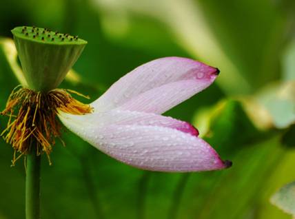 待荷花花瓣漸漸脫落,藏于花瓣之中,嬌小嫩黃的花心慢慢成熟,那就是蓮蓬。
