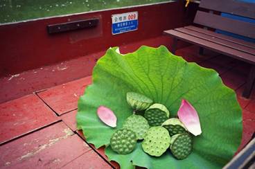 這段時間是蓮蓬的高產期,工作人員每天采摘新鮮的蓮蓬,供坐船游客品嘗。