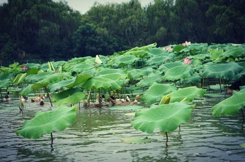 幾處荷花凋謝之后變成了清新的蓮蓬。