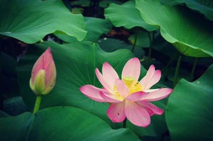 花色由淺粉向著純白漸變,嫩黃的花蕊藏在當中孕育著蓮子。