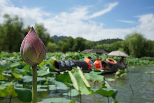 乘著會稽烏篷,翠綠的蓮葉隨著微風涌動,將絲絲暑氣消散,令人身心舒暢。淡淡的荷花清香,仿佛一切的浮躁與不安在這一刻都被沉淀。