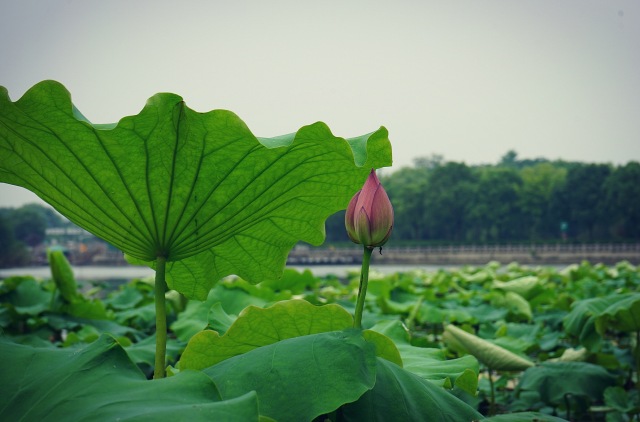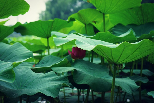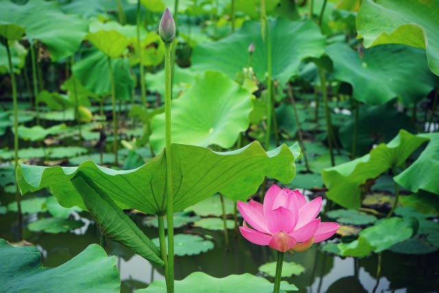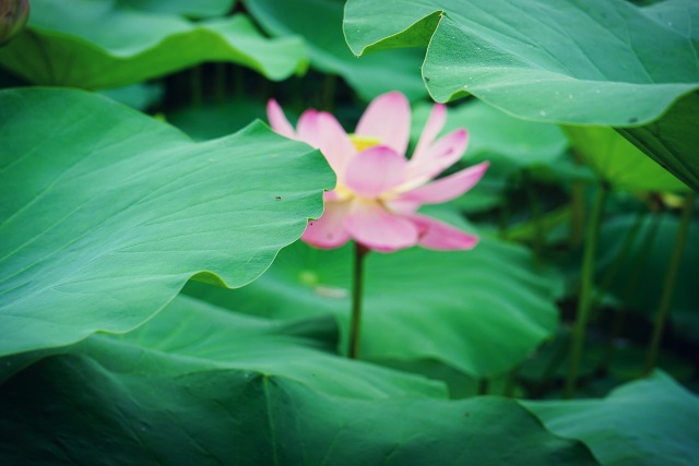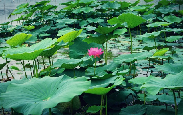 粉紅的花朵在層層疊疊的荷葉中顯得格外清新婉約。
