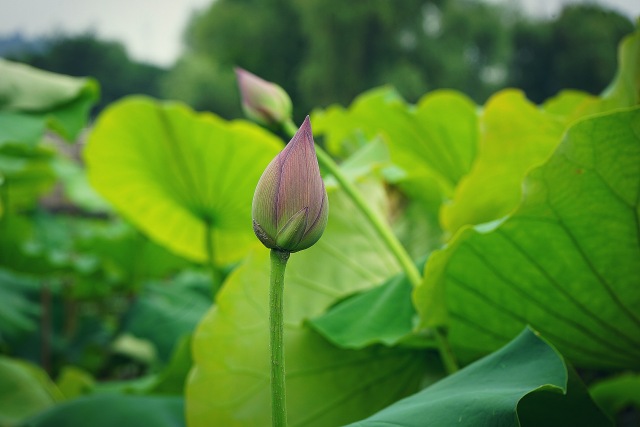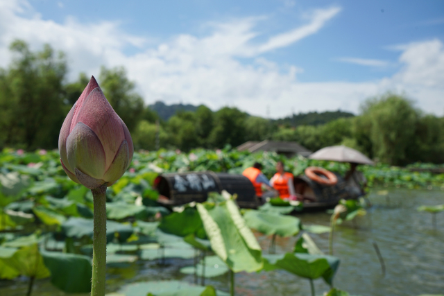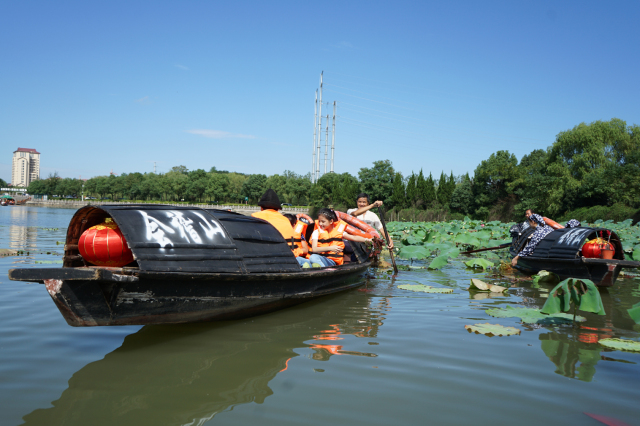 烏篷劃進荷塘,發現已有不少含苞待放的花蕾。再仔細一尋,發現熙熙攘攘荷葉下藏著一朵、兩朵映日紅蓮,讓人驚喜連連。