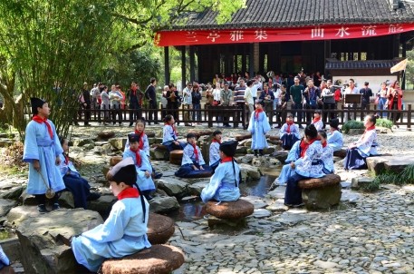 嘉賓們在“蘭亭羲之小導游社團”隊員的帶領下,聽鵝池故事、蘭亭碑史、訪祖孫御碑;體驗“曲水流觴”詩詞大會;還在臨池十八缸前,感受“蘭亭少兒流觴書畫社”隊員的書藝展示;并匯聚鵝池碑亭前,一起吟誦《蘭亭集序》,活動內容豐富,來賓們嘖嘖稱贊。