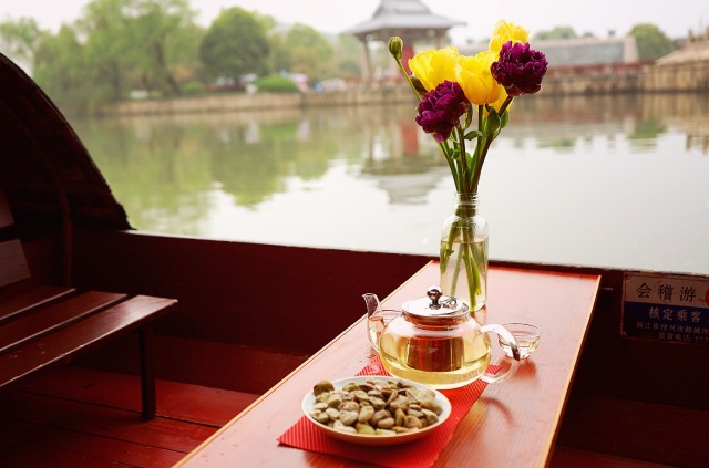 劃過河面蕩起漣漪,穿越在古橋與時空之間。我們還準備了具有紹興特色的下午茶套餐,一邊品嘗、一邊談笑欣賞沿途風景,看陽光照耀下水波蕩漾的河流,別有一番滋味。