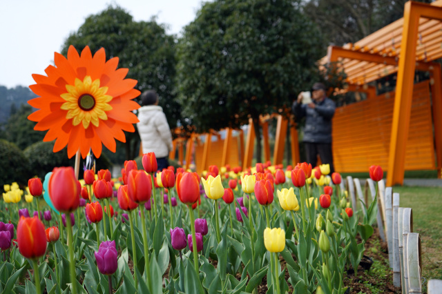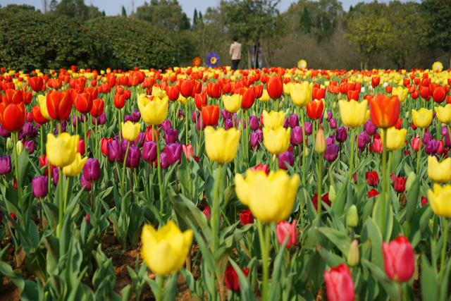 在陽光的滋養下,30萬朵郁金香花縱情盛開,交織成五彩花田,游客們沉浸在花海里享受大自然春日最美好的禮物。