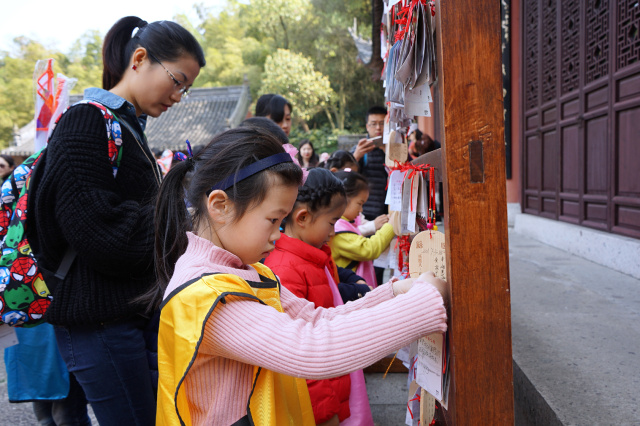 將寫有心愿的祈福卡,認真地掛到祈福架上。